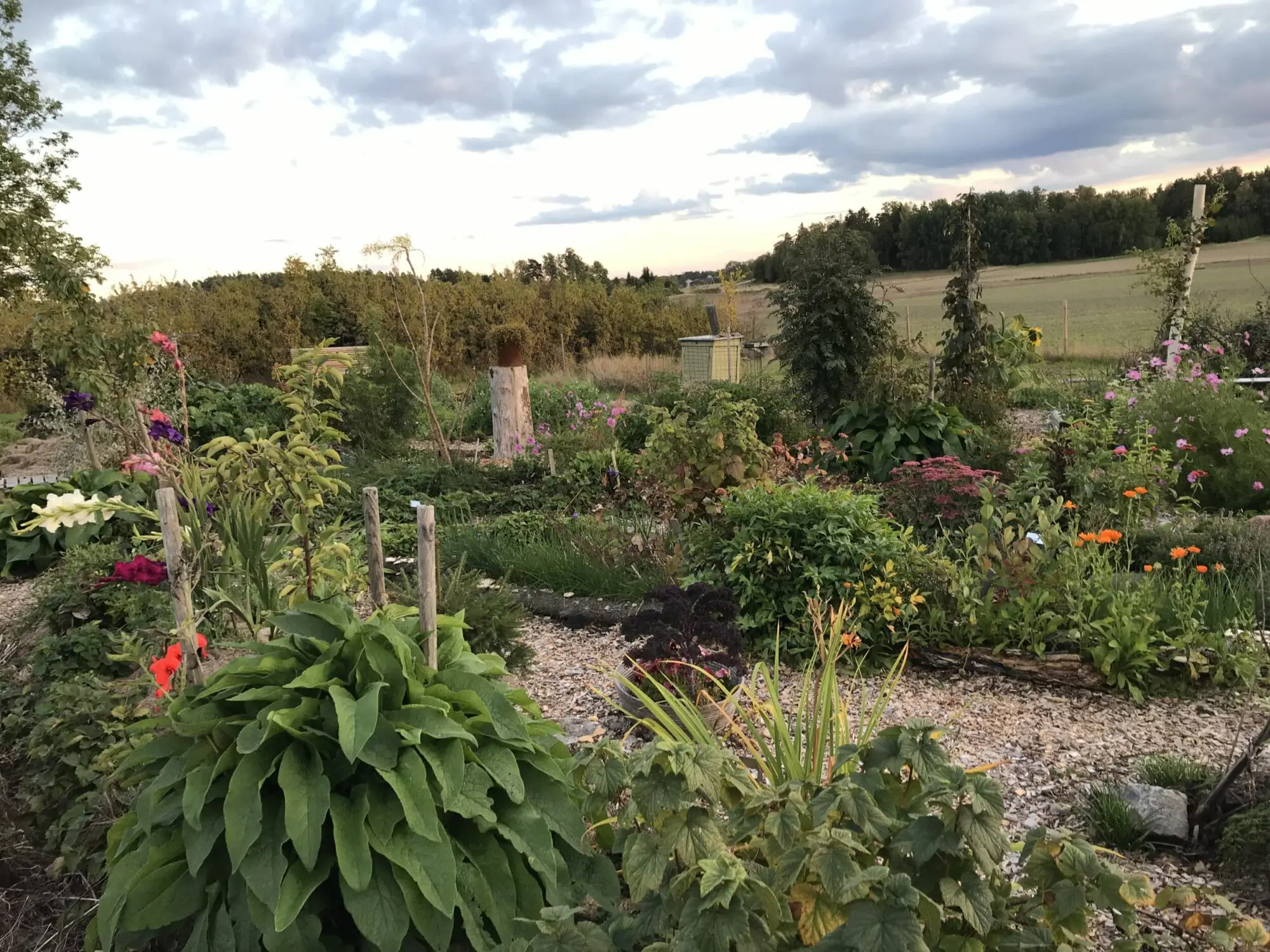 I rabatterna invid huset samsas ätbart med blommor och vindruvor. Det finns sandbäddar och hügelbäddar för köksväxter och vilda delar för mångfald. Ett växthus ger en längre odlingssäsong. Tomtens möjligheter för mikroklimat utnyttjas för mer värmekänsliga träd, som valnöt, ätbar kastanj, persika, kvitten, minikivi och mullbär.
