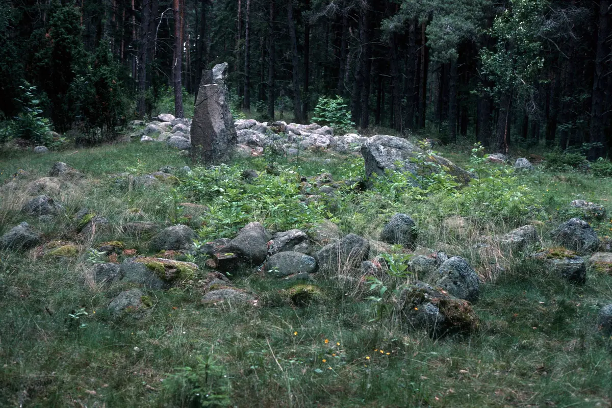 Uppe på åskrönet står tre höga, resta stenar som flankeras av två stora högar. Tillsammans bildar de en alldeles rak linje och det är tydligt att hela monumentet har konstruerats enligt en särskild plan. Tänk bort dagens skog, så förstår du också att läget var väl utvalt, högt och synligt på långt håll. Gravar, men också en plats för religiösa ceremonier – det är bara att fantisera om vad som försiggått där!