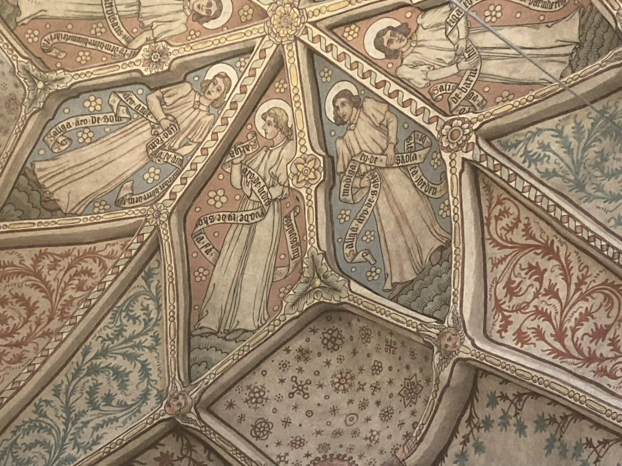 Som de flesta kyrkor har den byggts om och till vid många olika tillfällen. Målningarna i valven och på väggarna inne i kyrkan är gjorda år 1903–04 av Carl Wilhelm Pettersson, men det syns att medeltida målningar var den stora inspirationskällan. Titta lite extra på de murade valvgubbarna, som ser ut att bära upp valvbågarna. Sådana förekommer lite då och då i medeltidskyrkor.